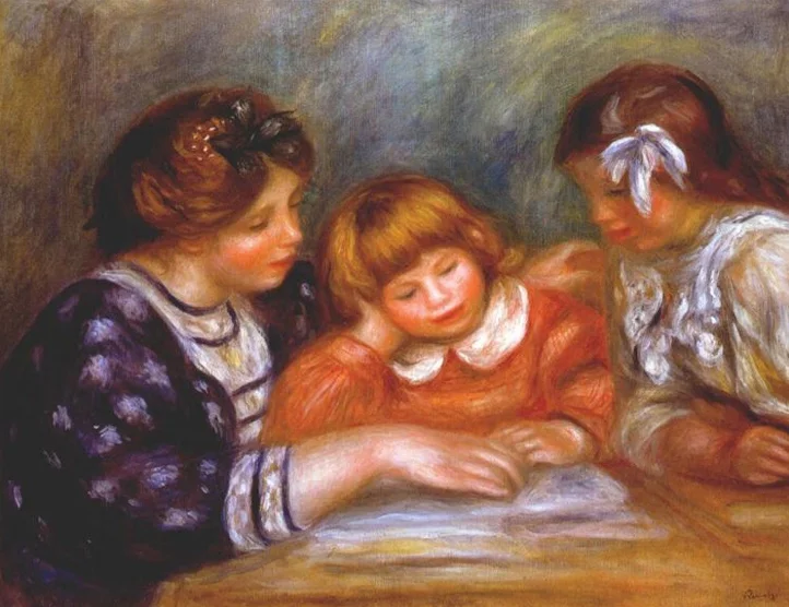 Notice the point of view of the “camera”, which is lower than someone standing near the table looking down, but slightly higher than the woman and the girls – that of a tallish person (maybe Renoir) sitting in a chair close to the table, but not at the table: close to the scene but not part of it. The compressed “telephoto” perspective brings the lesson closer to the viewer giving it more intimacy and detail, while it flattens out the form and presents it with more graphic strength.